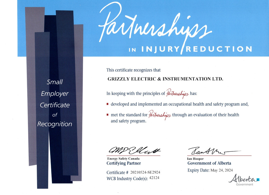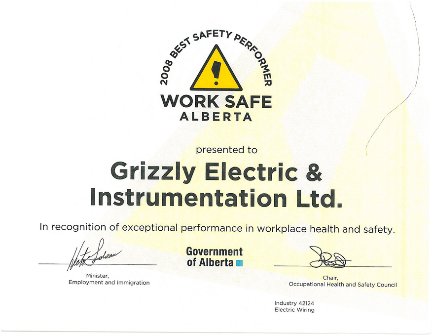 Grizzly Electric, and its sub‑contractors, support the goals of having Occupational Health and Safety as an equal partner to productivity and quality. Safe and Efficient production is the basis of Grizzly's operating policy.